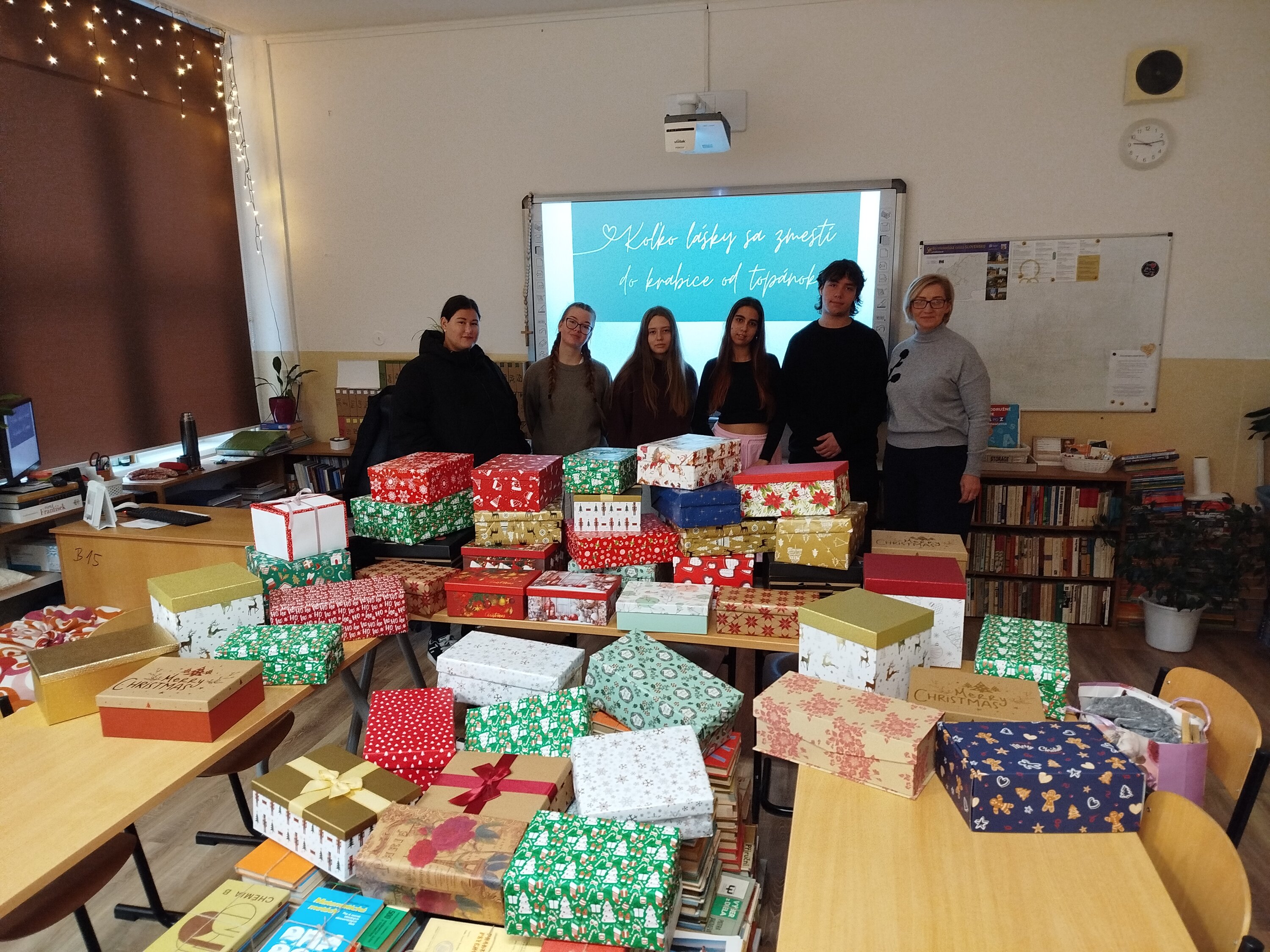 Tak ako po iné roky aj tento rok sme sa zapojili už do 8. ročníka projektu "Koľko lásky sa zmestí do krabice od topánok?" Učitelia, študenti a ich rodičia naplnili krabičky nielen materiálnymi darmi, ale do každej vložili aj kúsok svojho srdca.
