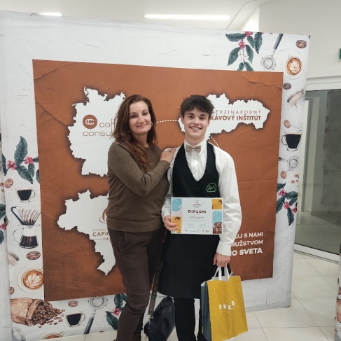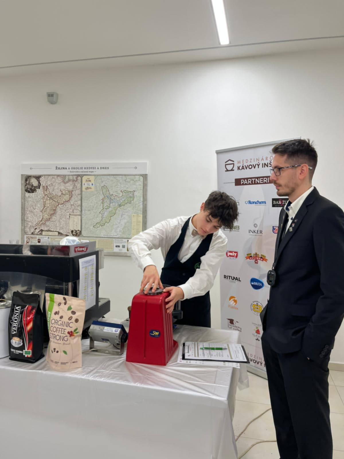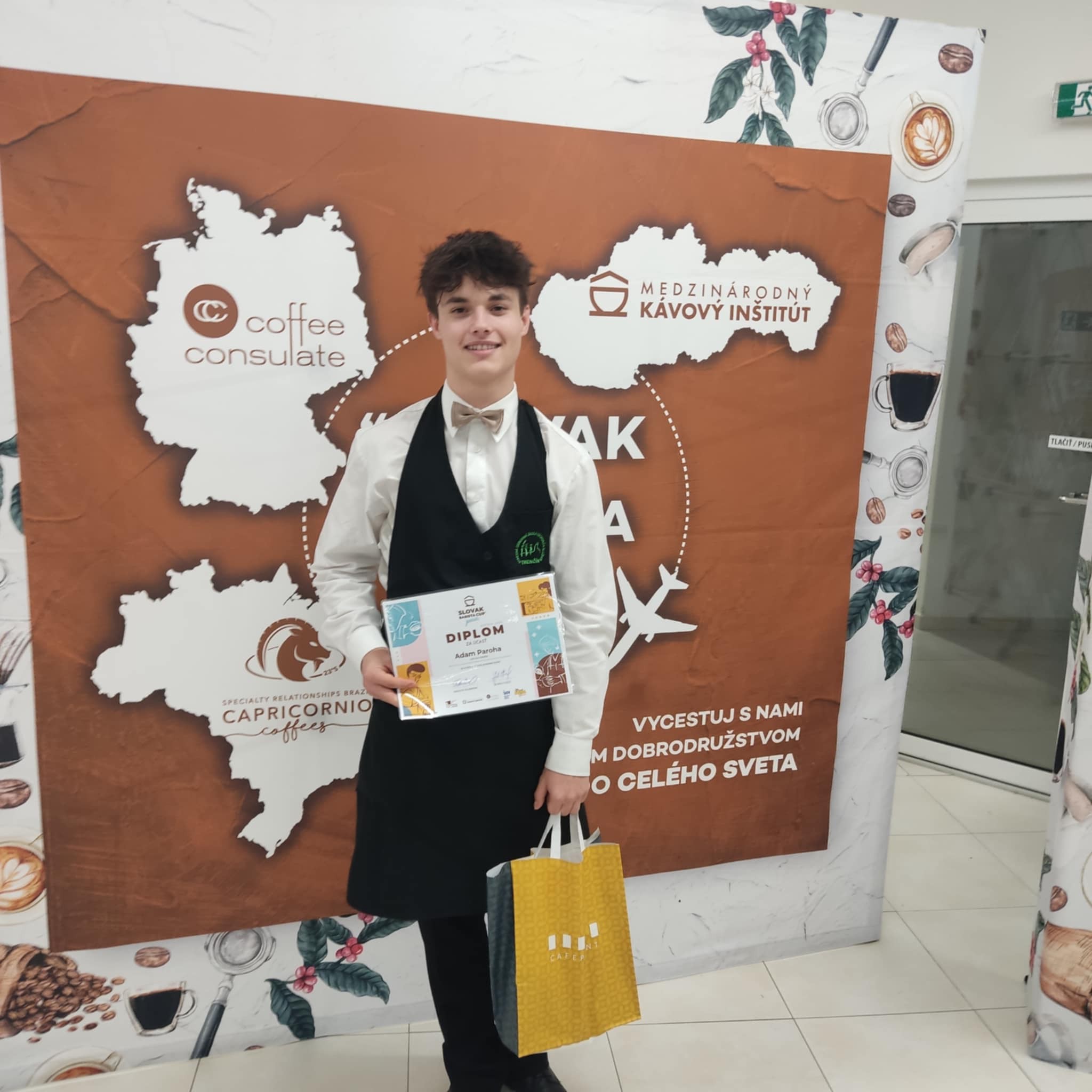 Našu školu reprezentoval pod vedením Ing. Gabriely Kelešiovej člen baristického krúžku Adam Paroha z III.HA. V časovom limite desať minút museli mladí baristi pripraviť pre odbornú porotu 2x espresso, 2x cappuccino, 2x voľný nápoj. Súčasťou súťaže bola aj disciplína nastavenie mlynčeka na vylosovaný druh kávy a alternatívna príprava nápoja. Oporou mu bola aj ďalšia členka baristického krúžku Adelka Bábiková, ktorá ho celý čas podporovala a zbierala cenné skúsenosti pre ďalšie súťaže.